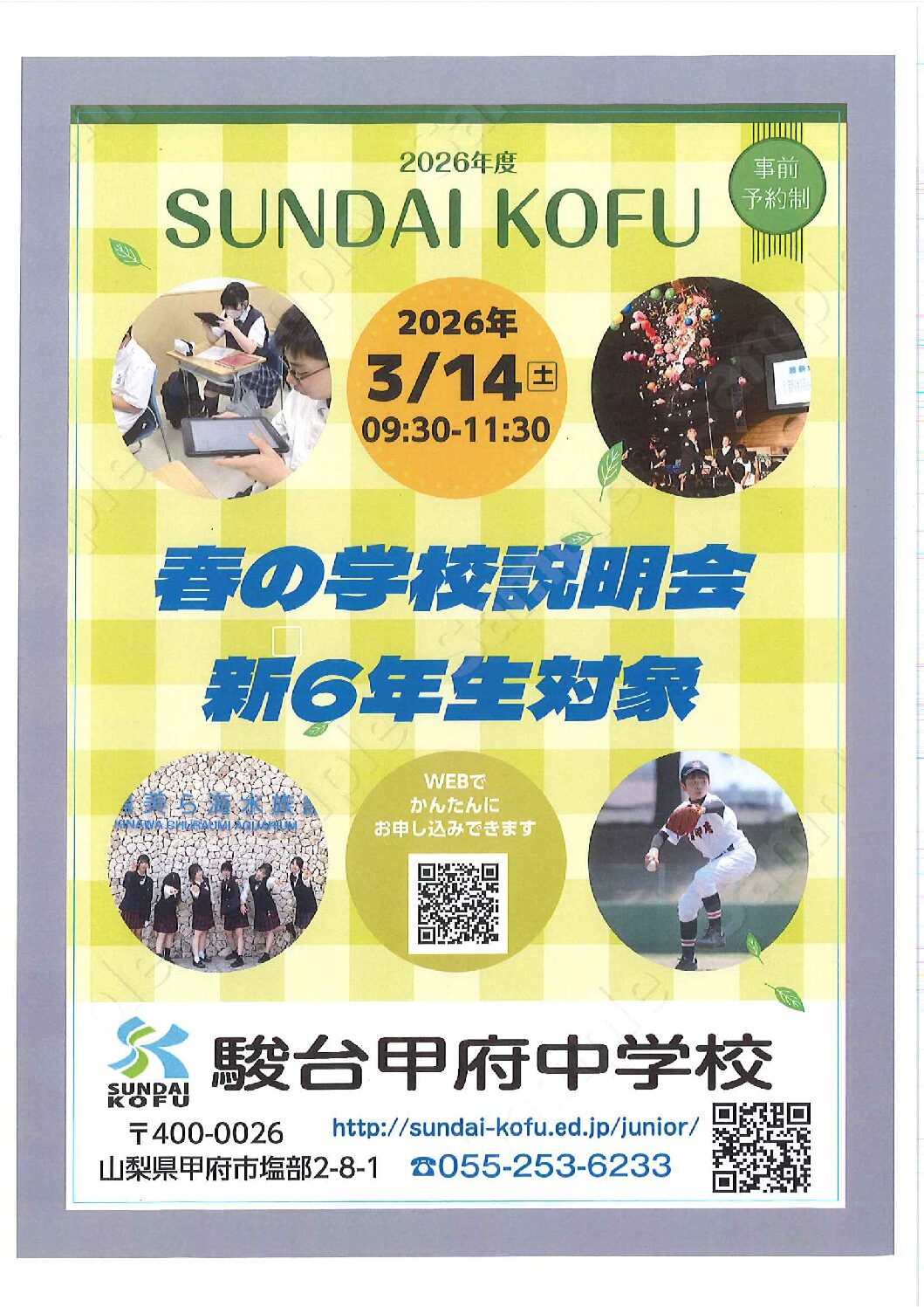 ホーム ニュース一覧 ニュース一覧 3学期終業式を行いました! 本日3月18日に、3学期の終業式を行いました。 3学期の成績優秀者と部活動の表彰を行い、生… 【2学年】第8回モラル弁論大会開催! 2学年は第8回モラル弁論大会を開催しました。 本当に回を重ねるごとに生徒たちの話し方の上達… 【新小6生対象】第1回学校説明会開催! 3/14(土) 4月から小学6年生になる皆さんを対象に、学校説明会を開催しました。今回はツ… 「マイナビキャリア甲子園」全国決勝大会出場! マイナビキャリア甲子園の決勝大会に、Innovation 部門 ファイナリストとして駿台甲… 【2学年】修学旅行最終日! いよいよ最終日!スーツケースを送り、朝食を食べて首里城に向かいます。7年前の火災から工事も… 【1学年】将来の職業について考えました! 3月12日 1学年は大ホールに集まり、中学・高校・大学を卒業したあとの進路に… 【2学年】修学旅行3日目! 修学旅行3日目。昨日から段々と気温が上がり、今日は夏らしい陽気となりました。これまで平和学… オーストラリア&ニュージーランド海外研修① 先日卒業したばかりの3年生が、オーストラリアとニュージーランドへ12日間の海外研修に行って… 【2学年】修学旅行2日目! 2日目の朝を迎えました。まだ肌寒さはありますが、南国らしい空気を感じます。午前中は3つの班… 【1学年】第4回モラル弁論大会を実施しました! 3月10日 第4回のモラル弁論を実施しました。生成AIやSDGsなど昨今注目されているキー… 新高1春期予備学校講習会! 新高1生を対象に駿台予備学校の講師の先生方による春期講習を実施しました。英語科の山口先生、… 【2学年】修学旅行1日目! 本日から今年度のメインイベント、修学旅行です!3月9日から12日まで32期生は沖縄に滞在し… ☆3/14(土)第1回学校説明会(新小6生対象)☆ 小学生・保護者の皆さま 3/14(土)AM第1回学校説明会(新6年生対象) … 第31回卒業証書授与式 3/4(水) 雪の予報に心配しながら迎えた卒業式当日。空を見上げると、そこにはまぶしい青空… 3年生を送る会を行いました! 2/27(金) 卒業証書授与式を間近に控えた今日、新生徒会の企画のもと、3年生を送る会を行… 課題研究全校発表開催! 2/26(木) 課題研究全校発表が行われました。各学年の中から優れた研究を行ったとして選ば… 第2回生徒総会開催! 本日4限の時間帯に第2回生徒総会を実施しました。今年度の生徒会活動・委員会活動・部活動のそ… 【サッカー部】ユースリーグ開幕! ユースリーグ(Dカテゴリー)が開幕しました。 第1節 駿台中 1-6 富竹笛南中 得点… 【1学年】課題研究発表会! 2月7日(土) 1学年の課題研究の学年発表会が行われ、各クラスから選ばれた生徒が発表をしま… 【3学年】スキー教室2日目! 2/6(金) 昨日に引き続き、スキー教室を実施しています。今日はインストラクターさんについ… 【2学年】歌語り公演を開催しました! 2/6(金) 2学年は山本晴美さんをお呼びして、歌語り公演をしていただきました。沖縄の離島… 【3学年】スキー教室1日目! 2/5(木) 3学年の生徒を対象に1泊2日のスキー教室を開催しています。1日目はインストラ… 【2学年】修学旅行 事前学習講演会 1月30日(金) 本日、2学年は山梨日日新聞社 編集局次長 前島文彦様をお招きして、修学旅… 【1学年】授業参観&学年保護者会を開催しました! 1/29(木) 1学年の授業参観と学年保護者会が実施されました。 普段の授業の様子を保護者… 【2学年】授業参観&学年保護者会を開催しました! 1/28(水) 2学年の授業参観と学年保護者会がありました。A組:国語、B組:英語、C組:… 【探究学習部】アイスクリームをつくろう! 1/27(月)に探究学習部でアイスクリームを作りました。 材料はシンプルに生クリーム、砂糖… PTA指導部主催 保護者講演会 1月24日(土)に公営企業管理者の落合直樹氏をお迎えして、PTA指導部主催の保護者対象講演… 【3学年】授業参観&学年保護者会を開催しました! 1/26(月) 3学年の授業参観と学年保護者会を実施しました。今回が中学3年間で最後の授業… 【2学年】課題研究学年発表会開催! 1/24(土) 2学年の課題研究の学年発表会がありました。各クラスから選ばれた合計15名の… 生徒会役員選挙を実施しました! 1/23(金) 本日、生徒会役員選挙が行われました。今回の選挙では2学年の生徒会長と副会長… 学校紹介 卒業生の活躍(高校普通科HPへ) 合格実績(高校普通科HPへ) PageTOP
