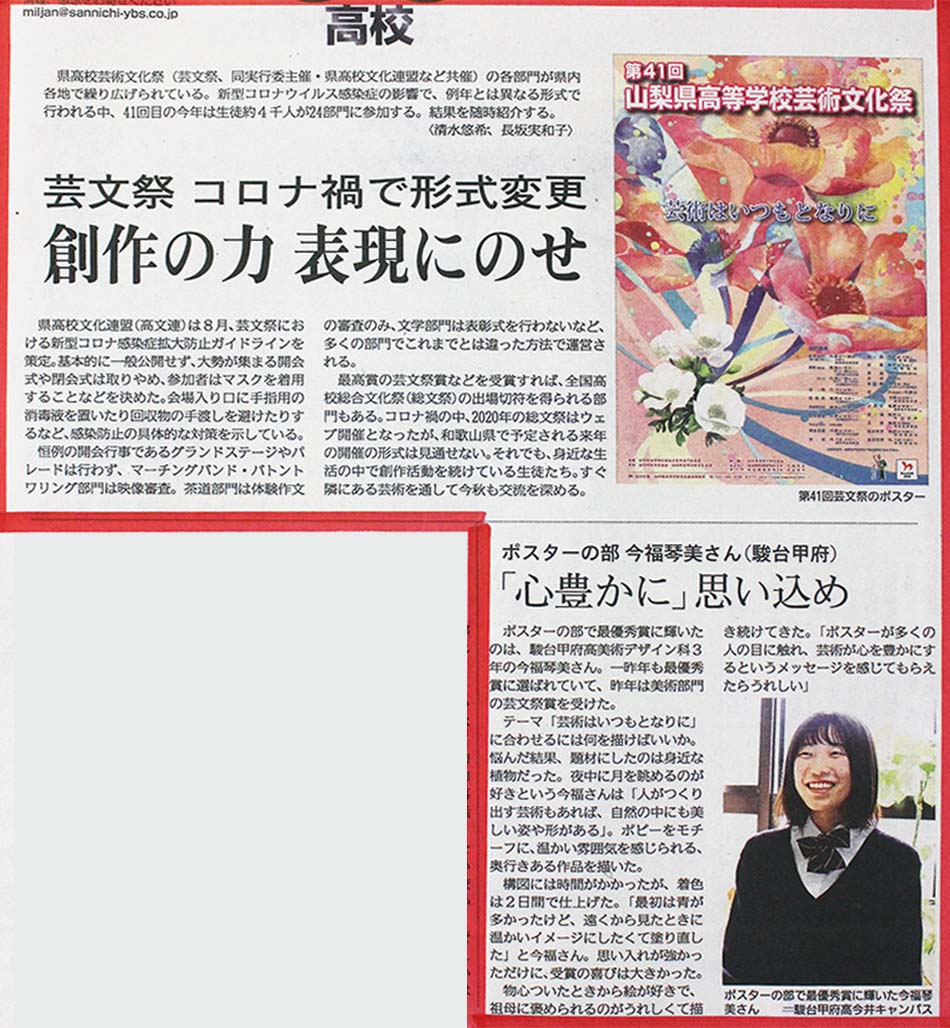 ホーム ニュース - 山梨日日新聞に生徒の活動が掲載されました 山梨日日新聞に生徒の活動が掲載されました 2020年10月13日 本校3年に在籍する今福琴美さんの原画 が山梨県高校芸術文化祭のポスターになり、山梨日日新聞に掲載されました。 学校紹介 進学実績 交通アクセス PageTOP