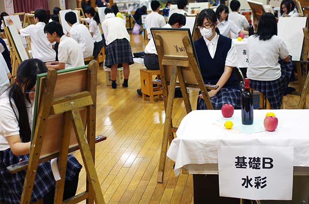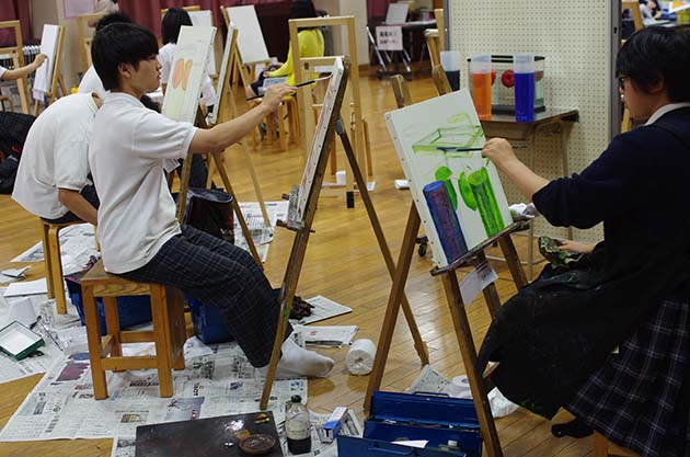 今年は甲府東高校をお借りして、6月11日、12日の2日間に実施され、県下の各高校から60人程の生徒が参加しました。本校からは、18名が参加し、デッサンや水彩、油絵、平面構成とそれぞれのコースで真剣に頑張っていました。