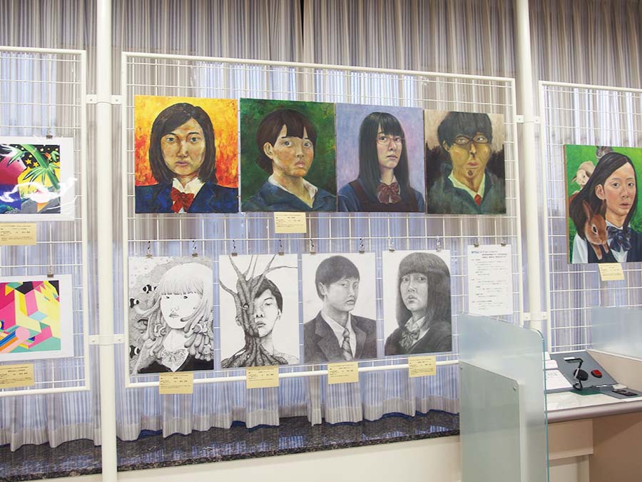 本校は 甲府南支店、城南支店、中道支店に約50点の作品を展示しています。1年生は自画像(油彩)、レリーフ(地肌感を活かして)、イメージ構成(幾何形体を組み合わせて生き物を表現)を展示しています。2年生は自画像(油彩)、平面構成の基礎練習でイメージ構成(隙間を活かした空間表現)、イメージデッサン(空想上の生き物)、イメージデッサン(…の中)、1月~12月のイメージ表現(平面構成)を展示しています。3年は様々な表現による自画像、コラージュなどを展示しています。(展示枚数の関係で、支店により展示してない物も有ります。)