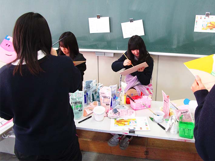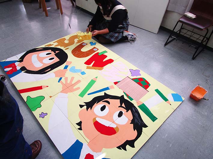 9時からほとんど休みも取らずに、12時頃塗り終り、ここで全体は解散し、仕上げの作業を希望した生徒は昼食をとって仕上げ。補修をしたり、輪郭線を入れたりし、更に完全に乾くのを待って、貼りあわせました。