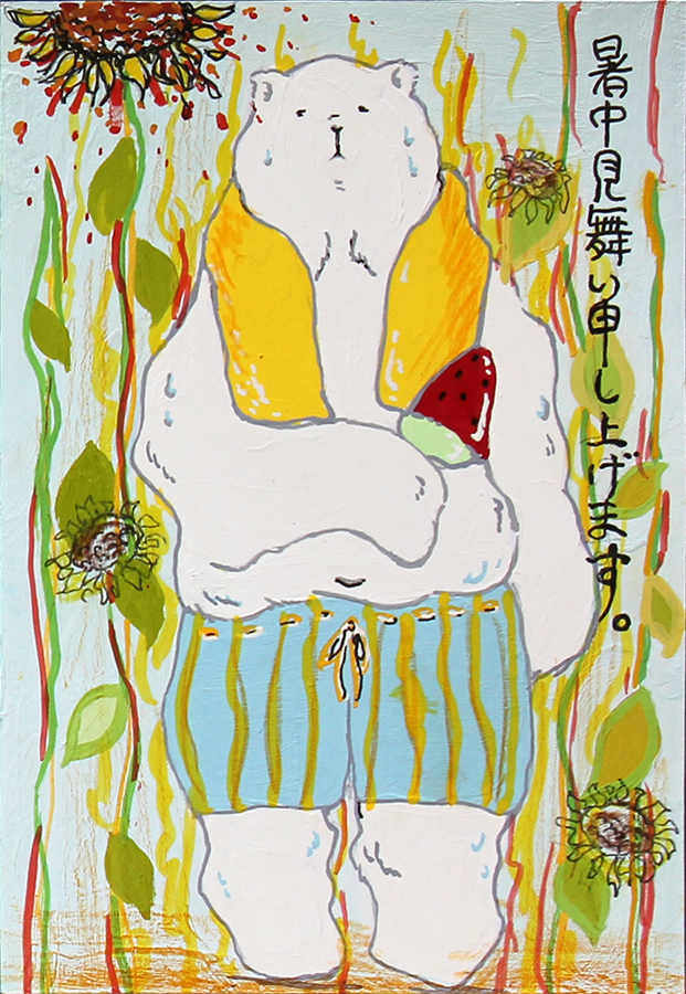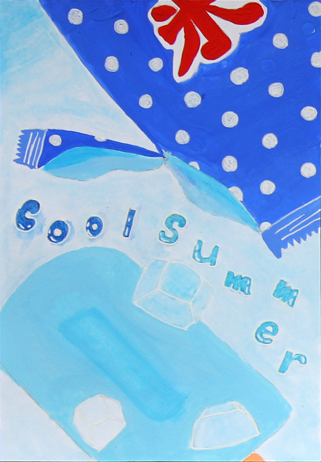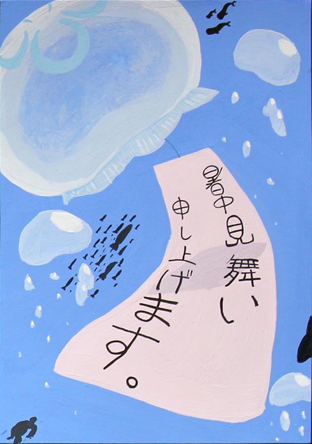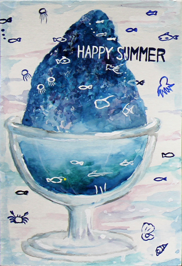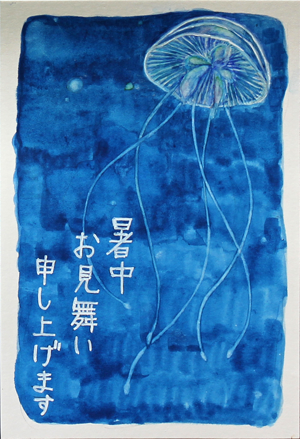 はがきサイズの暑中見舞いをひとり2枚制作します。描画材料は水彩、アクリル、切り絵、コラージュなどの手法で制作されています。