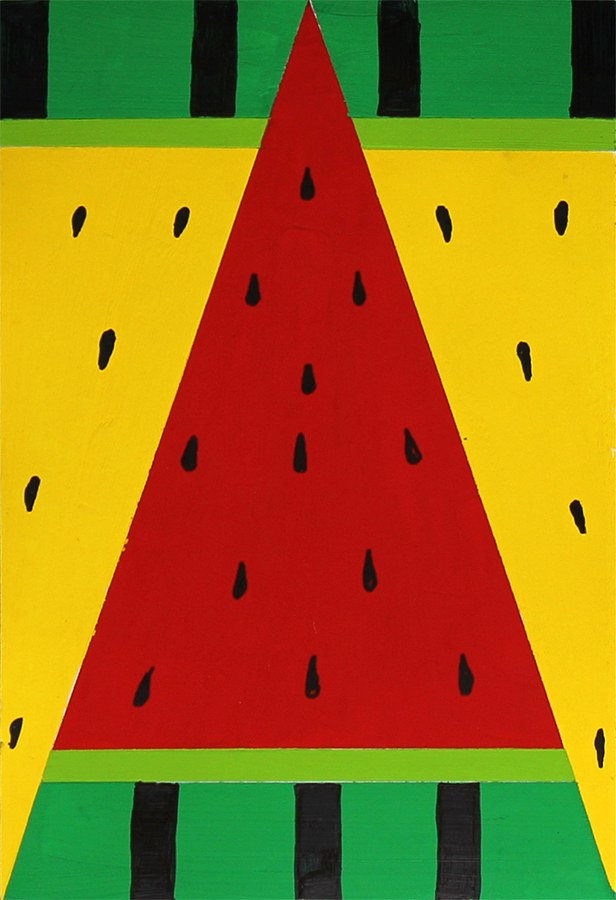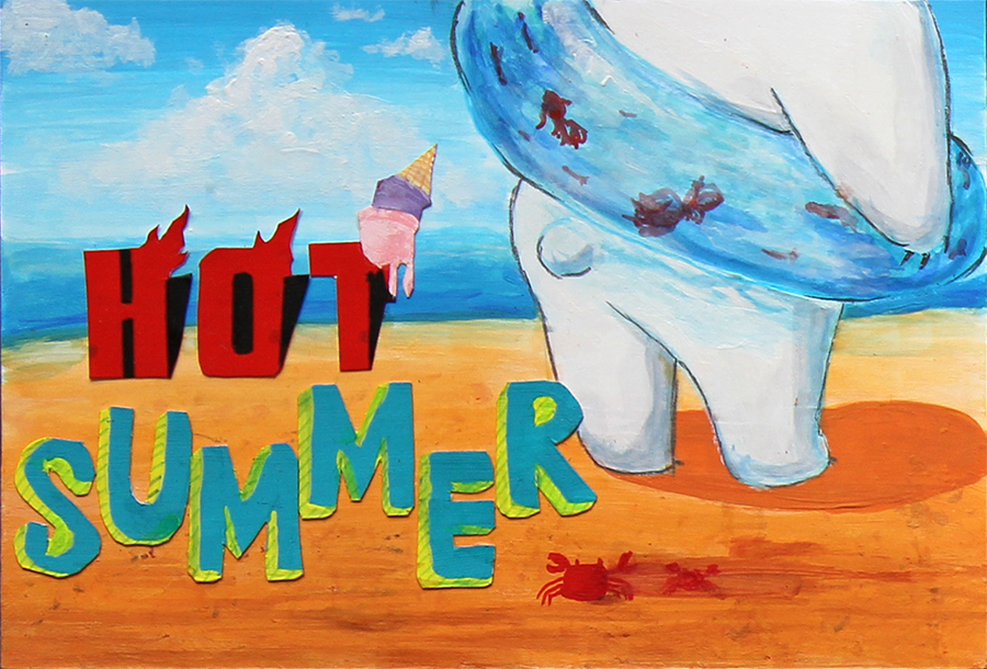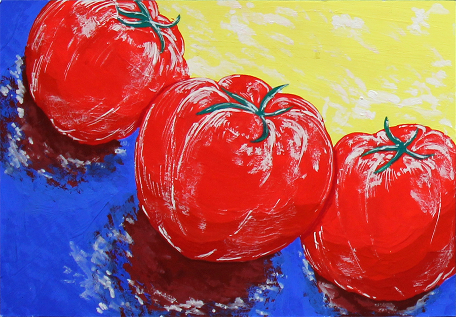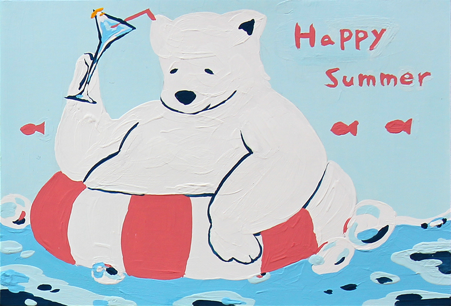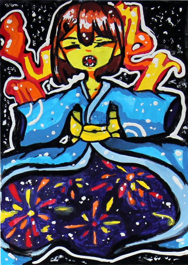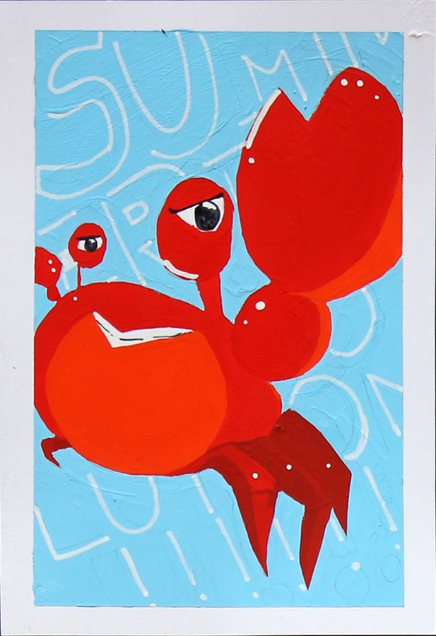 はがきサイズの暑中見舞いをひとり2枚制作します。描画材料は水彩、アクリル、切り絵、コラージュなどの手法で制作されています。