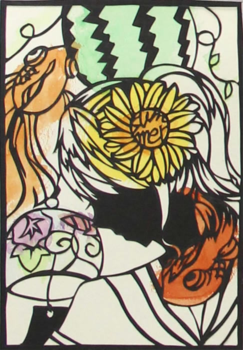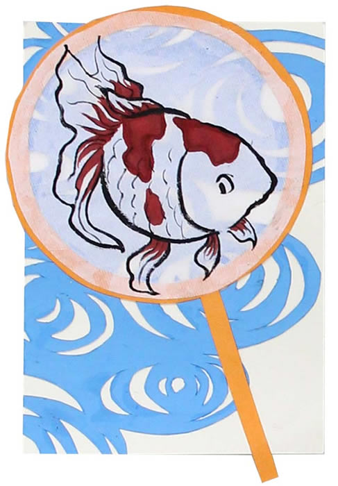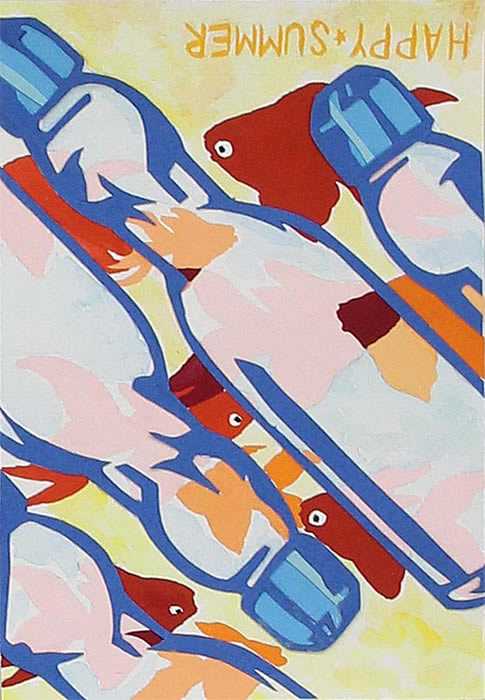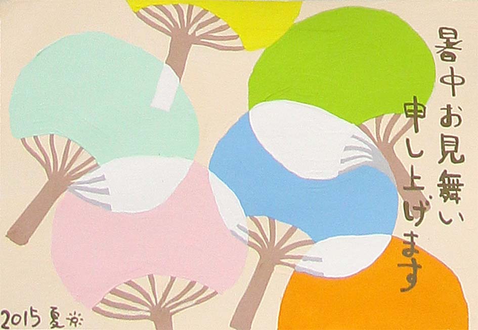 はがきサイズの暑中見舞いをひとり2枚制作します。描画材料は水彩、アクリル、切り絵、コラージュなどの手法で制作されています。