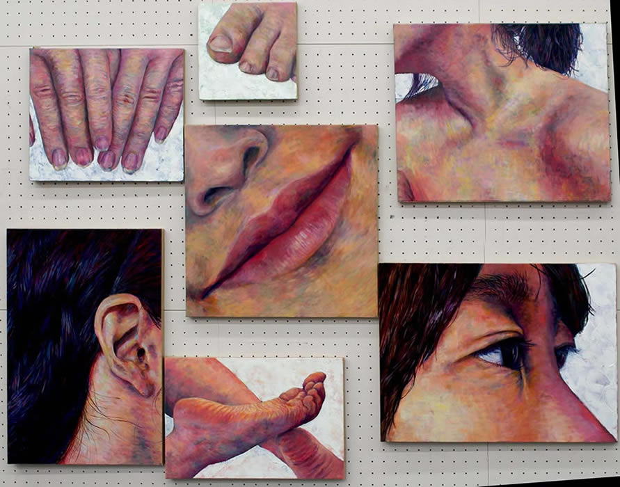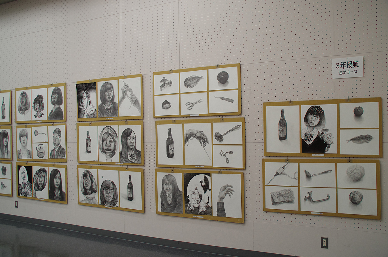 3年生の授業作品、受験対策用のデッサン課題が並びます。
