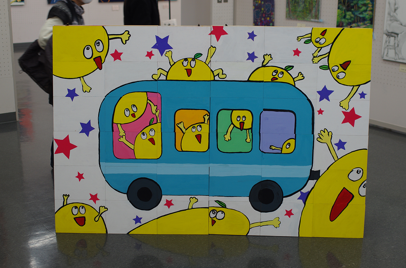 こちらは各学年が協力して1枚の絵を作り上げた作品です。 駿台今井校舎のバス停に壁画として飾られます。