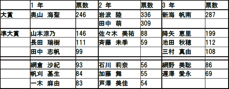 また、会場で行いましたコンクールには生徒を含め681人、3852票の投票があり、次のように各学年の順位を決定いたしました。