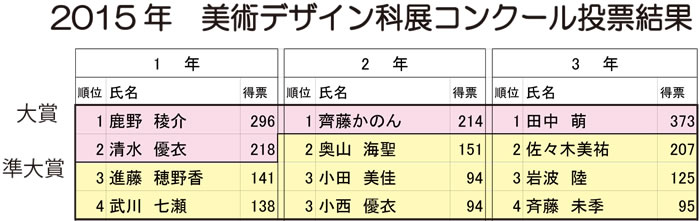 会期中には891人の方に来ていただき、会場で行いましたコンクールでは生徒を含め752人、4080票の投票があり、次の様に各学年大賞と準大賞受 賞者を決定しました。