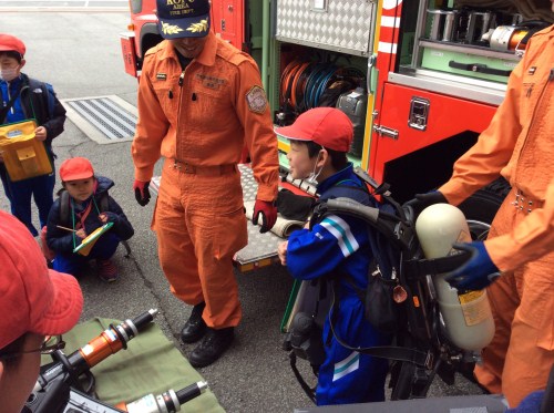消防士の方から普段の仕事や訓練の話を聞いたり、救急車や消防車について説明を受けたりしました。