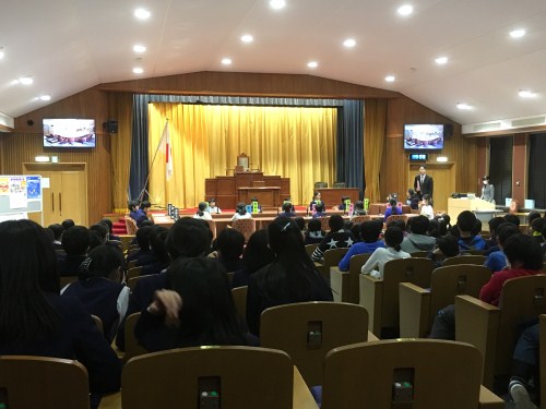 体験プログラムでは、模擬委員会や本会議を行い、押しボタン式の投票までを行いました。