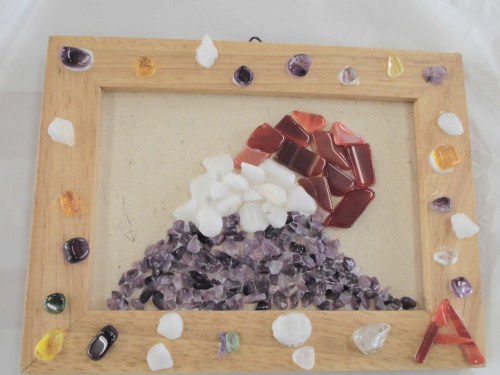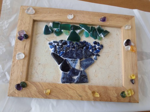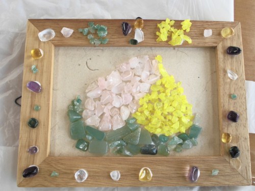 貴石フォトフレーム作りでは、事前に描いた完成図をもとに貴石を選び、ボンドで貼り付けました。