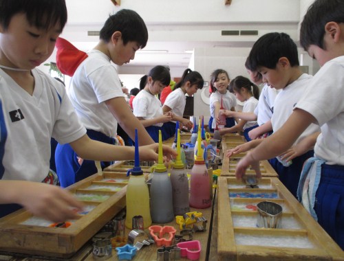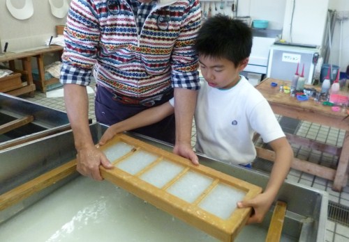 和紙作りでは、原料を漉いて好きな色や模様をつけて、