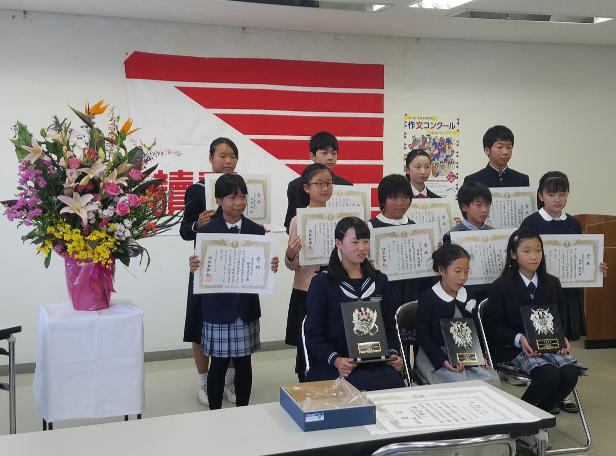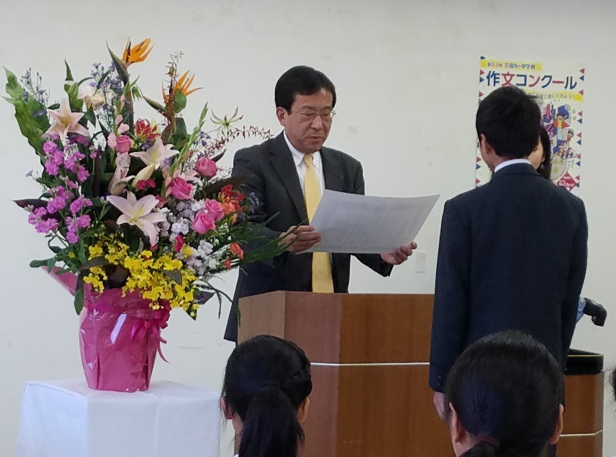 第67回全国小・中学校作文コンクールにて、1年B組平田啓人くんが、見事、読売新聞社賞を受賞し、11月5日、読売新聞甲府支局にて執り行われた表彰式に出席しました。平田くんの作品は、『「英語」という翼を広げて、国境を越える』というタイトルで、世界と自分をつなぐ道具としての英語の必要性や、その道具をいかに身に付け、自分らしく、自分の道具として用いることの大切さを述べたものです。受賞に際し、「このような賞をいただけることになるとは、想像もしていませんでした。この賞を取れたことを自信に変え、頑張りたいと思います。」と話してくれました。