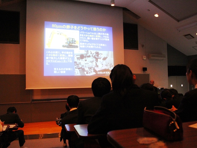 ご講演では、マイクロマニュピレイターを操作して見られる実験映像や、クローン技術の仕組み、その難しさなどを大変詳しく教えてくださいました。生徒からも「クローン同士で交配するとどうなるのですか?」、「同じ卵子に二つの精子の核を入れるとどうなりますか?」など具体的な質問が活発に寄せられました。