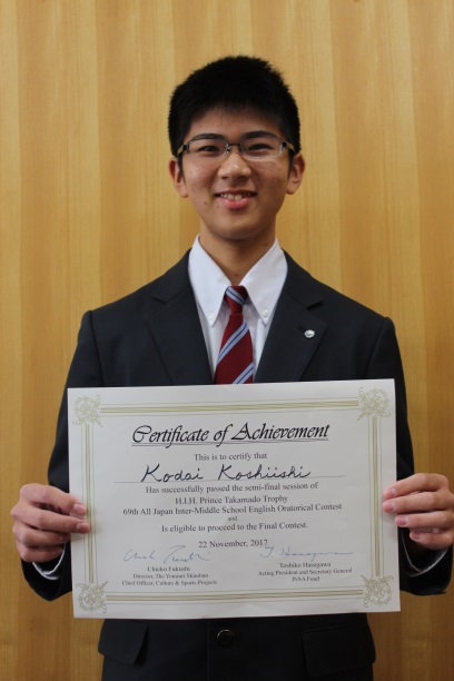 11月22日(水)に、高円宮杯第69回全日本中学校英語弁論大会関東地区大会が東京都赤坂区民ホールで行われ、本校から山梨県代表として3年生 輿石晃大さん が出場しました。この大会は、題材テーマを自分で決めて、そのことに関して自分の意見を英語で書き、その内容を5分間のスピーチで披露するものです。輿石さんは新聞記事で目にしたことから興味を持った子供の貧困問題について、フードバンク山梨に参加した経験を交えて“Charity Begins at Home”(「愛は小さな一歩から」)というタイトルで弁論に挑みました。その結果、山梨県ではただ一人関東地区の代表に選出され(関東で6名、全国では27名のみ出場)、翌々日24日の決勝大会へのコマを進めることができました。決勝大会当日は、最後の発表者という強運を手に、堂々と発表することができました。大会開催中は、全日本中学生会議にも参加でき、全国から集まった仲間からたくさんの刺激を得ることもでき充実した日々を過ごすことができました。この経験を糧に、さらなる飛躍を期待しています。
