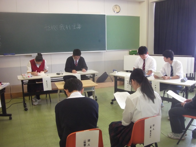 この模擬裁判では、裁判官、検事、弁護人、被告、証人の、それぞれの役割を負った生徒が、配布された通りのシナリオを順番に読み上げながら実際の裁判の様子を見せるというものでした。他の生徒は傍聴席で裁判の行方を見守りました。