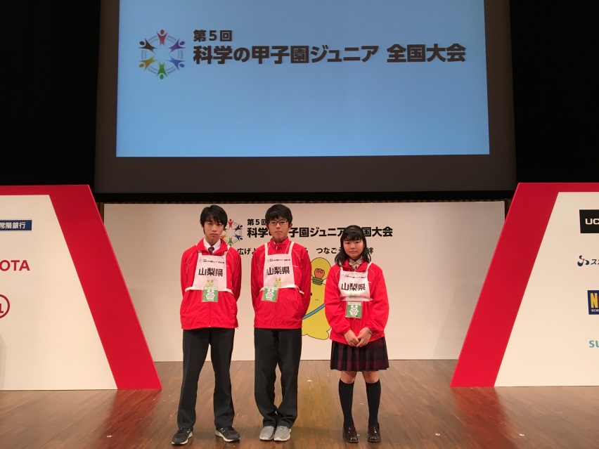 12月1日(金)から3日間、茨城県つくば市のつくば国際会議場をメーン会場として第5回科学の甲子園ジュニア全国大会が行われ、本校からは8月の県予選で最優秀賞に輝いた2年生3名が、山梨大学教育学部附属中学校の1年生3名と合同チームで山梨県代表として出場しました。本大会では、全国の都道府県の代表チームが集結して、科学の思考力・技能を競い、理科・数学における複数分野の競技に協働して取り組みました。残念ながら、今回は上位入賞を果たすことはできませんでしたが、各自が自分の持ち味を発揮し、実技競技①では、装置の軽さを競う部門で、狙っていた全国1位を獲得することができました。未知の分野に仲間と挑戦することで、互いの絆を深めるとともに、科学の面白さを再認識できたようです。