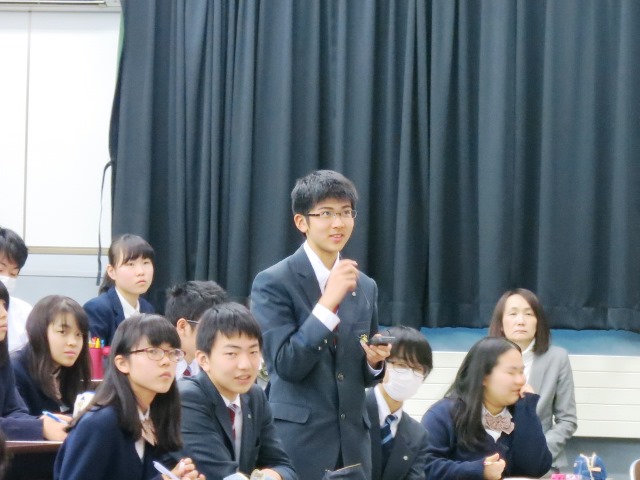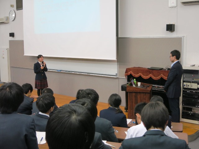 また、ご自身の中学時代、高校時代の成績状況などを含めて細かく学習について、成績について話してくださいました。学習法に関しては、継続して努力し続ける「やり抜く力」が大切だと説いてくださり、授業も高校領域に差し掛かり、学問の深さに悪戦苦闘している生徒たちを勇気づけてくださいました。卒業生からの力強いアドバイスは心に響きました。