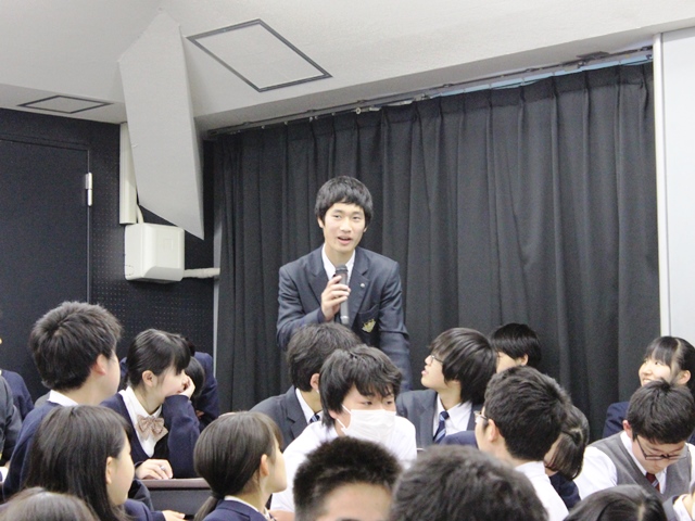 横内氏は、まず高校の進路選択でどのように考えたか、大学では進路実現に向けてどのように行動したかなどをお話しされ、現在新聞記者としてどのような仕事をしているかなどを詳しくお話しして下さいました。