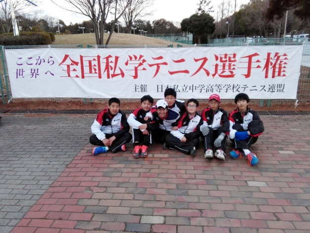 12月26日~28日に、神戸総合運動公園で開かれた第4回全国私立中学校テニス選手権大会に本校男子テニス部が出場しました。団体戦の二回戦から登場した本校は、浜松日体中学校(静岡)に2-1で勝利したものの、三回戦で東海大菅生中学校(東京)に0-2で敗れたため3位決定トーナメントに回りました。次戦で桐蔭学園中学校(神奈川)に2-1で勝利した後、光泉中学校(滋賀)に0-2で敗れた結果、再び5位決定トーナメントに回って青山学院中学校(東京)に2-1で勝利したものの、東海大菅生中と再び当たったため、本戦での対戦結果が優先され、最終的に6位(全20校中)という結果となりました。残念ながら5位入賞にあと一歩でしたが、第1回大会では16校中14位だったことから見れば、大躍進となりました。 続いて行われた個人戦では、2年久保嶋亮太君が三回戦まで進出、同じく2年の中村柊翔君が準決勝まで進出し、最終的には4位(全40人中)と健闘しました。 補欠として同行したものの出場機会がなかった選手もいましたが、全員の健闘を称えたいと思います。