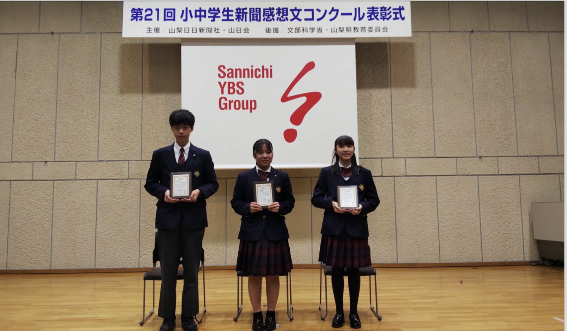 ホーム ニュース - 新聞感想文コンクール授賞式に参加しました! 新聞感想文コンクール授賞式に参加しました! 2024年12月09日 12/7(土) 小中学生を対象にした新聞感想文コンクールの表彰式が、山日YBS本社で開かれました。本校では毎年夏休みに生徒が取り組みコンクールに応募しています。今年度は2年生より井上琥太さん、三澤茜さん、1年生より鈴木愛菜さんが参加し、表彰を受けました。受賞された皆さん、おめでとうございます! 学校紹介 卒業生の活躍(高校普通科HPへ) 合格実績(高校普通科HPへ) PageTOP