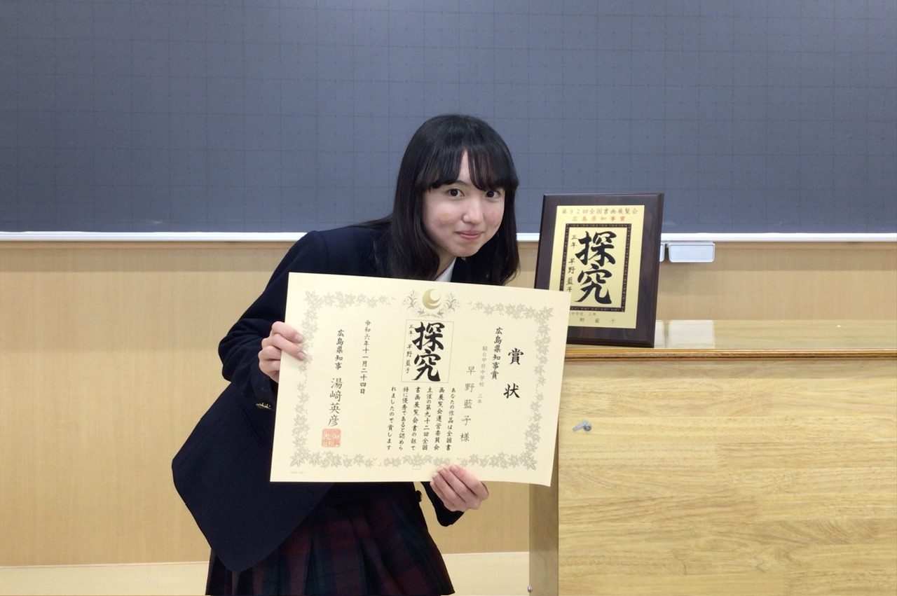 ホーム ニュース - 全国書画展覧会 広島県知事賞受賞! 全国書画展覧会 広島県知事賞受賞! 2024年12月20日 12/20(金) 本校では毎年夏休み課題の一環として応募している全国書画展覧会において、3学年の早野藍子さんが見事、広島県知事賞を受賞しました。この賞は特別賞の一つで、全国の応募作品の中でも各学年の生徒一名ずつにしか授与されない非常に栄誉ある賞です。早野さん、おめでとうございます! 学校紹介 卒業生の活躍(高校普通科HPへ) 合格実績(高校普通科HPへ) PageTOP