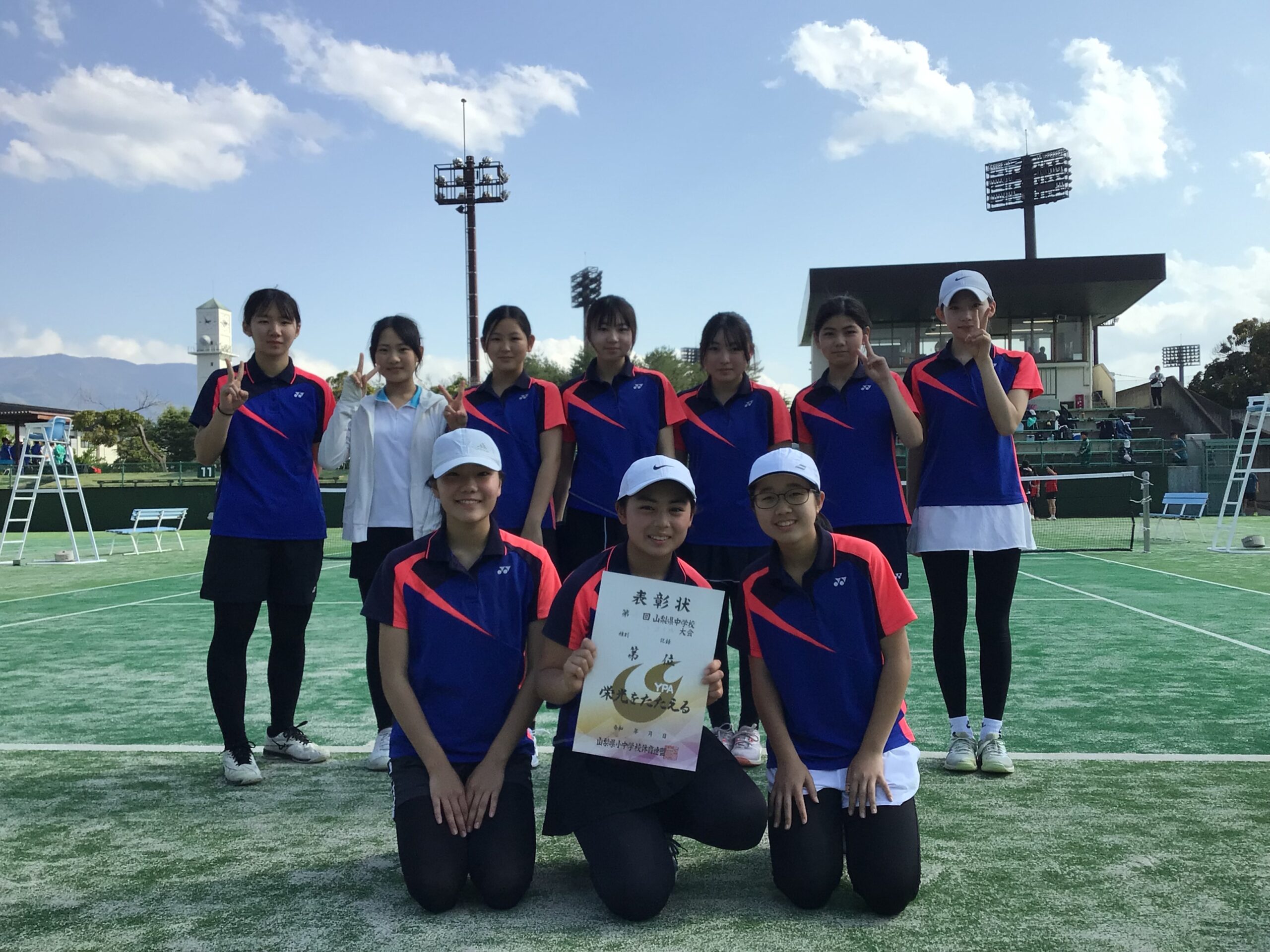 4月26日(火・祝)、5月3日(土)、5月10日(土)小瀬テニスコートで第29回山梨県中学校テニス選手権大会が行われました。女子テニス部は団体戦とシングルスとダブルスに出場しました。団体戦では3位という成績でした。