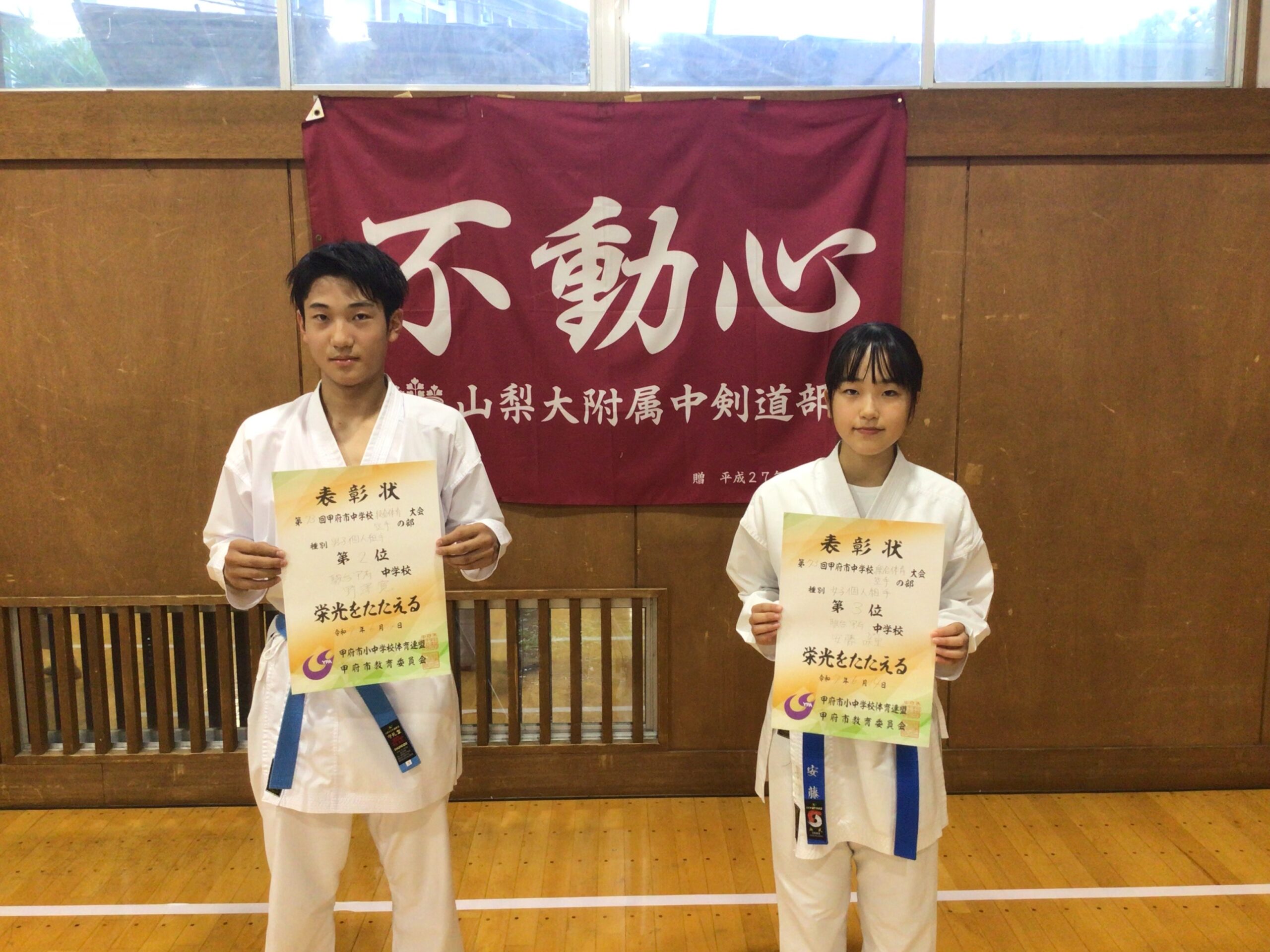 甲府市中学校総合体育大会(空手の部)が、山梨大学附属中学校武道館にて行われました。本校からは2名の生徒が出場しました。結果は、2年生の野澤寛さんが男子組手で2位、2年生の安藤咲里さんが女子組手で3位となりました。各自がそれぞれ道場で積み上げてきたものを存分に発揮することができました。応援ありがとうございました。