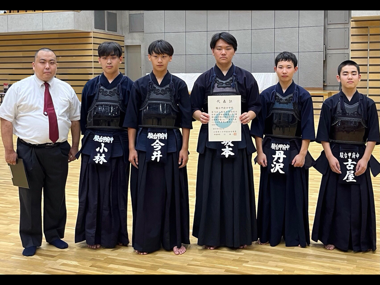 山梨県総体剣道の部が開催され、本校より男子団体戦に5名の生徒が参加しました。初戦・2回戦と順調に勝ち上がり、ベスト4を決める試合では勝敗の行方が大将戦までもつれ込む大熱戦となりました。全員が全力を尽くして戦った結果、見事決勝リーグまで進出することができました。