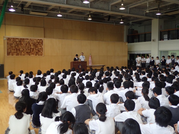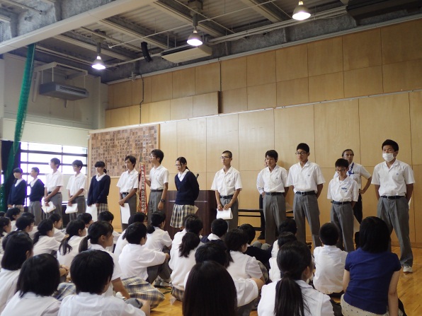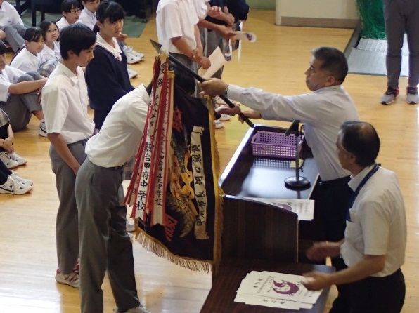 6月17日(金)・18日(土)にかけて、第65回甲府市中学校総合体育大会が行われました。 本校は、野球・ハンドボール・サッカー・テニス・バスケットボール・バレーボール・卓球・陸上の8種目で、団体戦・個人戦に挑みました。結果は、ハンドボール男子優勝、テニス部男子個人での準優勝、テニス部男女シングルス、ダブルスでの入賞の他、陸上部が男女14種目で入賞し、うち5種目で県大会へ進出、男女卓球や男子バレーボールが県大会出場を決めるなど、期待に応える結果を出しました。また、個人として水泳・柔道競技に参加した生徒も素晴らしい結果を出しました。3年生の今までのクラブ活動の努力と栄誉に、後輩たちから大きな拍手喝采が起こる中、報告会は閉じられました。県大会でも、素晴らしい結果を出してくれることを期待しているところです。