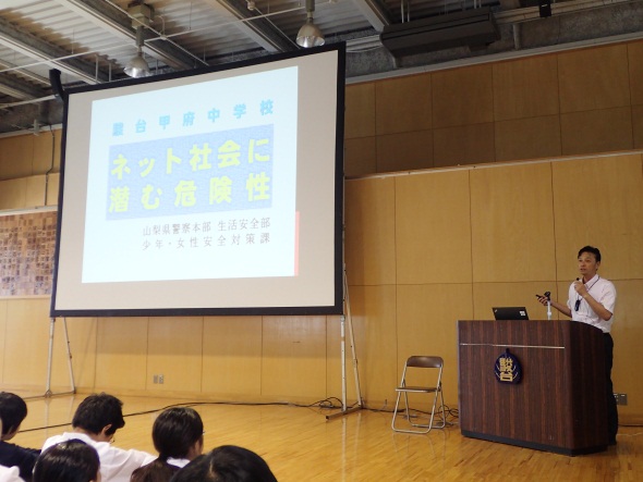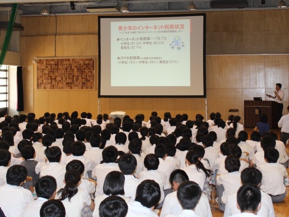 7月15日(金)に県警本部・少年女性安全対策課少年対策官の岡林健児先生をお招きして、「ネット社会に潜む危険性」と題した「SNS講演会」が6限に開かれ、全校生徒が参加しました。
