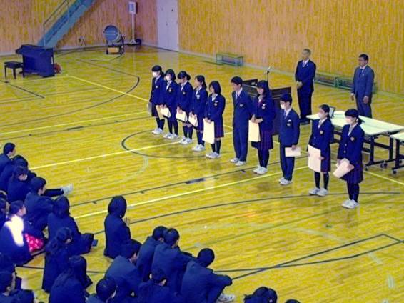終業式に先立って、運動部や文化部の各種大会やポスター・読書感想文等の各種コンクールの表彰、2学期のノート大賞や成績優秀者の表彰が行われました。今学期も、多くの生徒が様々な活動に挑戦し、優秀な成績を収めました。