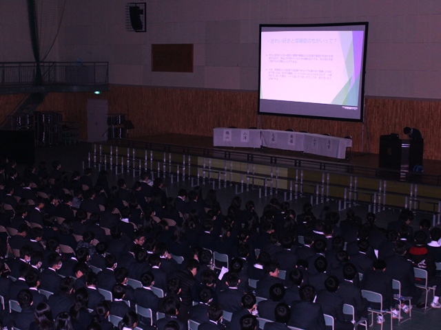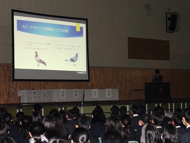 3月8日(水)、課題研究発表会が行われました。課題研究は、全校生徒がそれぞれ研究課題を自分自身で決めて1年をかけて研究し、発表するものです。今年も、鳩の帰巣本能、富士山、火星で生命は生きられるか、韓流ドラマ、腸内フローラ、アニメ、地雷、震災復興など多岐に及ぶテーマで生徒諸君は研究してきました。
