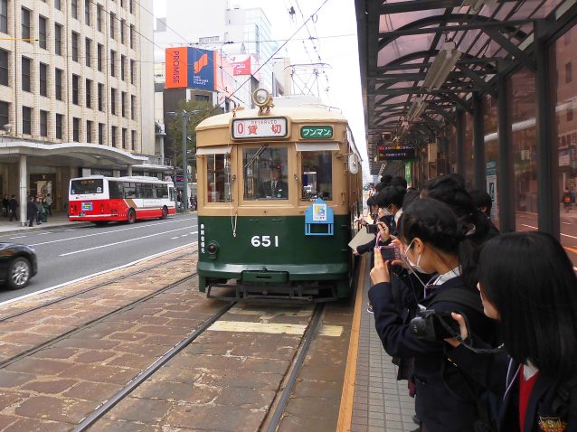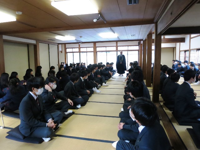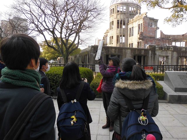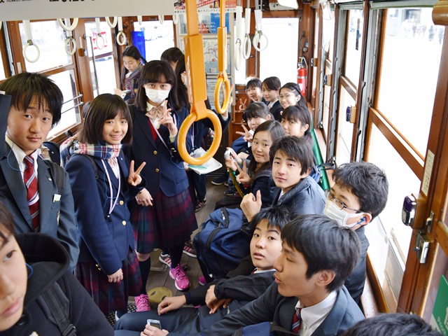 2日目はボランティアガイドに案内していただき、8グループに分かれての「原爆ドーム」などの碑めぐりをし、平和記念資料館を見学しました。現存2車両のみとされる被爆列車(路面電車)に乗り、お昼は名物のお好み焼きを食べました。 午後は広島から新幹線で京都に入り、建仁寺「禅居庵」で座禅体験をしました。
