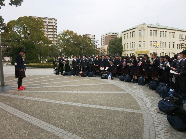 初日は、名古屋から新幹線に乗り広島へ。宮島では鹿の歓迎を受けて厳島神社に参拝しました。夕方、平和記念公園「平和の子の像」に折り鶴アートを捧げる献鶴式を行い、学年全員で平和宣言を読み上げ、「HEIWAの鐘」の合唱をしました。また、夜は被爆者の方から貴重な被爆体験のお話を聞きました。