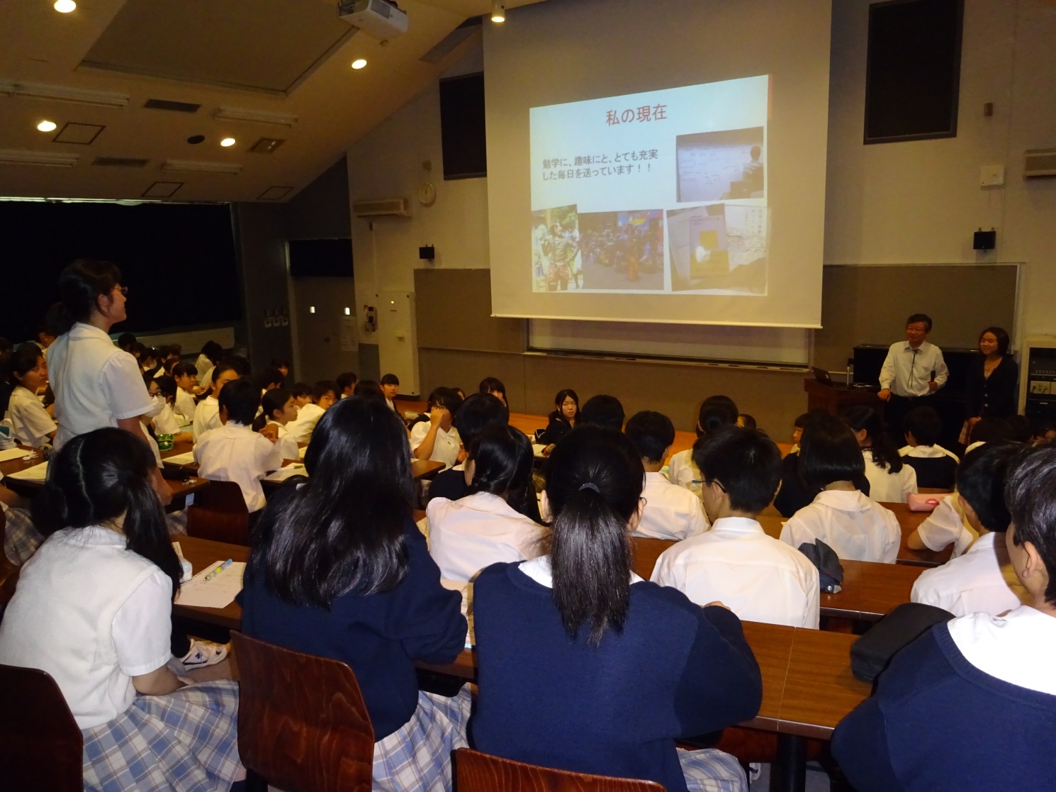 5月27日(土)、CS(土曜授業)の時間を利用して、中2生を対象に、高校OG・星合耀子さんを招いて講演会を開きました。星合さんは今春、山梨県で初めて東大推薦入試を突破し、文学部で勉強を始めた方で、課題研究にも取り組む駿中生に貴重なアドバイスをしてくれました。研究テーマを見つけ論文を書き、教授の前でプレゼンをするという東大推薦入試に順応する資質の萌芽を、自らの中学時代に見つけた星合さんは、「興味を持ったことを深めましょう」、「自分の考えたことは誰かに話していきましょう」、「学ぶということに真摯に向き合いましょう」といったメッセージを後輩たちに投げかけてくれました。東京大学に進んだのも楽しいことを押し進めた結果と語ってくれた星合さん。だからこそ、今と真剣に向き合うこと、全ての基礎となる勉強はとても大切だと話してくれました。自分が好きだと思うものが将来の入口になるという励ましは、目の前のあれこれに奮闘する生徒たちの背中をそっと押してくれるような経験になったと思います。今回の講演会に星合さんがつけてくれたタイトル『好きを極める』をもう一度かみしめてがんばりましょう。