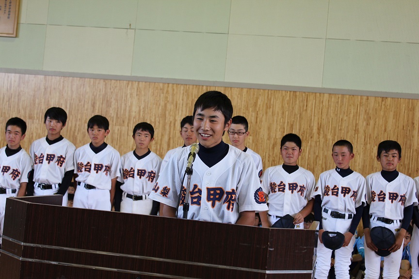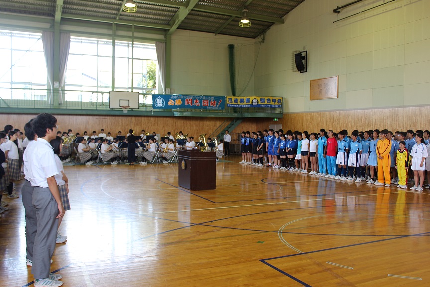 6月16日(金)・17日(土)に行われる第66回甲府市総合体育大会に向けて壮行会が行われました。 吹奏楽部の演奏とともに選手が入場行進をした後、各部の代表が総体への決意表明を行いました。各部、「文武共存」をテーマに、厳しい練習を重ね、チーム全員で助け合いながら努力をして来ました。当日は、本校のスローガンである「チャレンジングスピリット」の精神を発揮し、悔いの残らないよう戦ってきてほしいと思います。ご声援の程宜しくお願い致します。