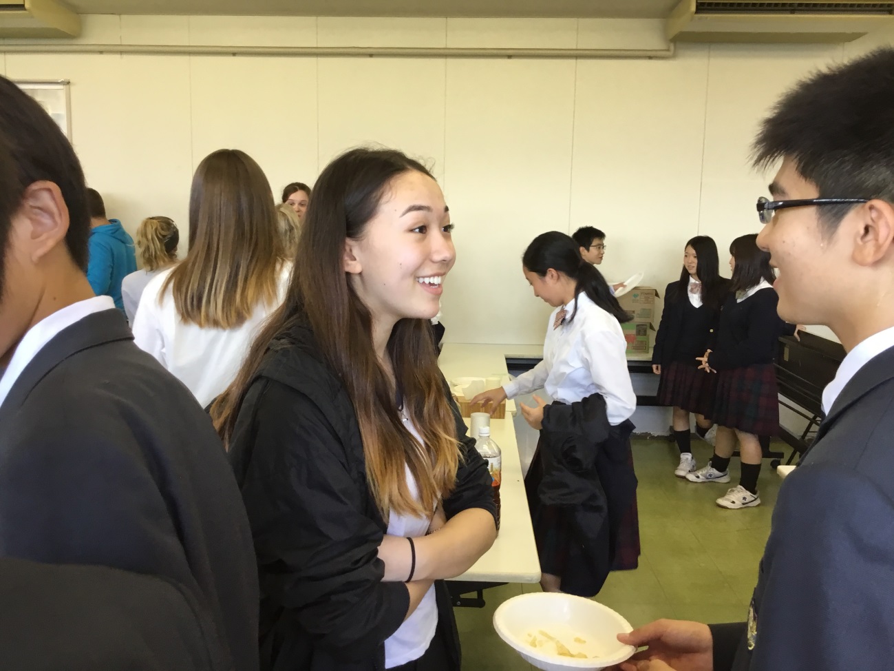 高校でホームステイの受け入れをしていた姉妹校(オーストラリア・エンデバー校)の生徒が中学にも立ち寄り、生徒と交流を持ちました。富士五合目を訪れた後のとても短い時間でしたが、ESSメンバーがお菓子やジュースをふるまいながらの交流でした。最初はおどおどと対応していましたが、時間が経つにつれ、趣味や学校生活について話も弾み、あちらこちらで笑顔の交流となりました。その後は、クラブ見学をしたり、ちょっぴり参加したり、思い思いに過ごしました。当日は、ホームステイで受け入れをしている高校生も同行しましたが、放課後のクラブ活動に励む後輩たちを紹介しながら、なつかしい中学キャンパスをともに楽しんでくれました。