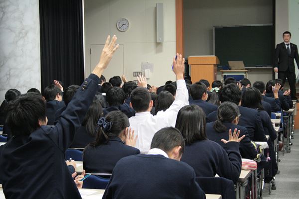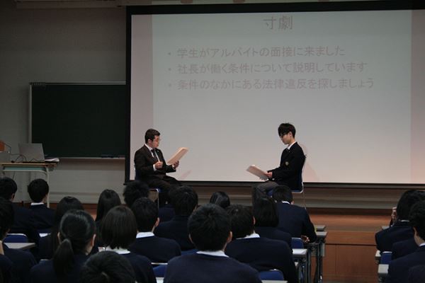 12月17日(木)に、1年生を対象として出前授業「高校生のための労働法」が行われました。講師は山梨県弁護士会から派遣していただいた武藤高晴弁護士(本校18期生)でした。アルバイトの面接を再現した寸劇を行ったり、生徒に質問したり、選択クイズを出したりと、参加型の活気ある授業でした。終了後には、全員からレポートを出してもらいましたが、「気持ちよく仕事ができる環境の整った会社で働きたい」、「会社という大きな組織にも意見ができるようにしっかりと法律が整備されていることを知りました」などの感想が書かれていました。文理選択を目前に控え、将来の就職についても考えはじめた生徒にとって、とても良い学習になりました。