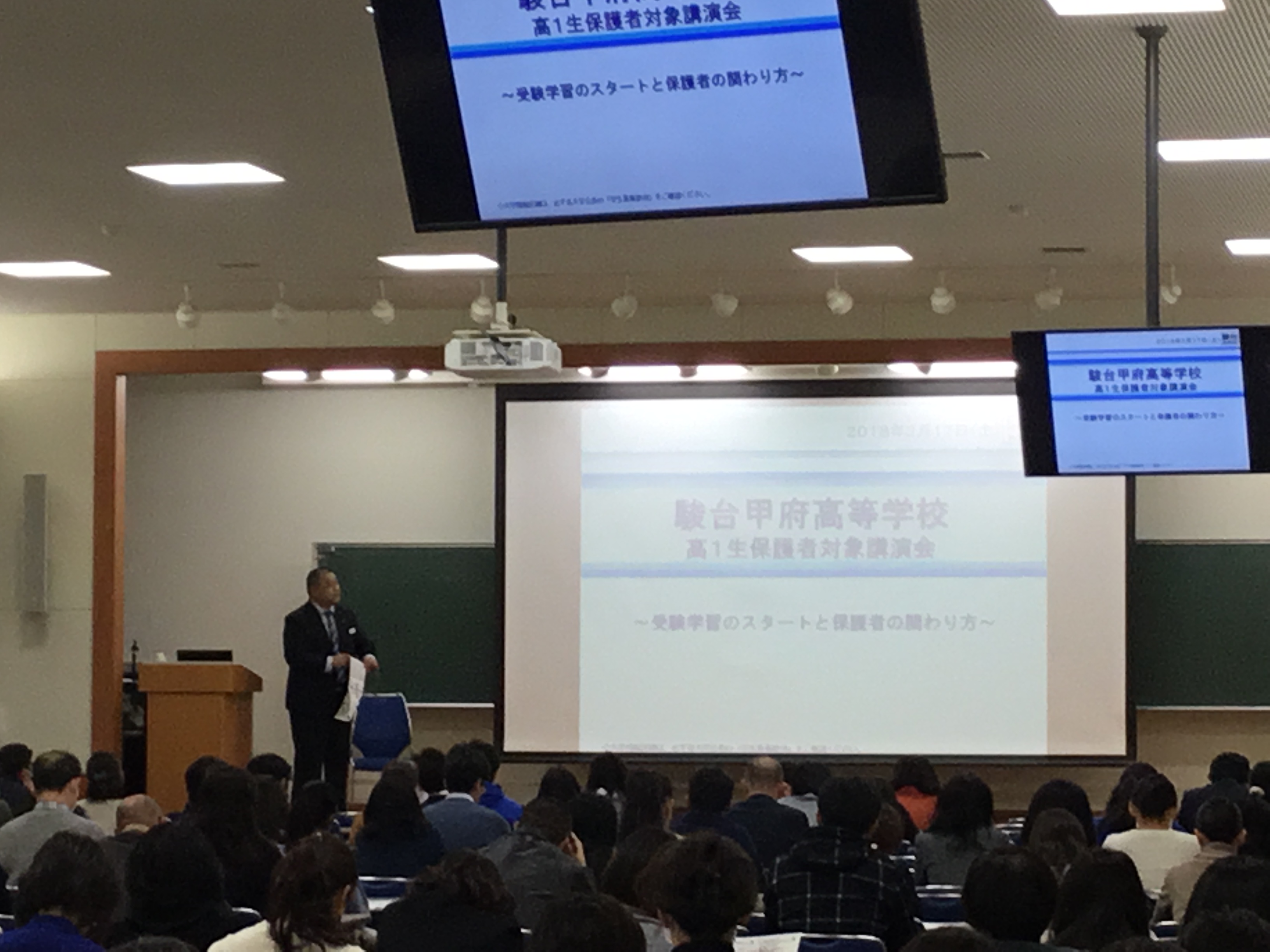 2月17日(土)、本校1学年の保護者を対象に、進路講演会を行いました。駿台予備学校立川校の目黒校舎長をお招きして、受験まであと2年という段階においてのご家庭でのお子様への接し方を中心にお話し頂きました。本校では保護者の皆様に有益なこうした情報も共有できる機会を継続的に設けています。